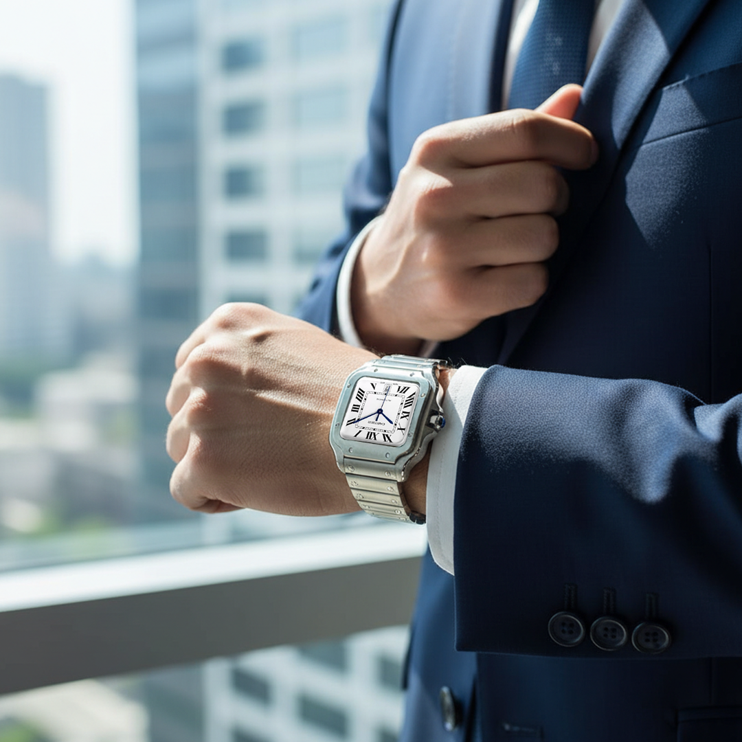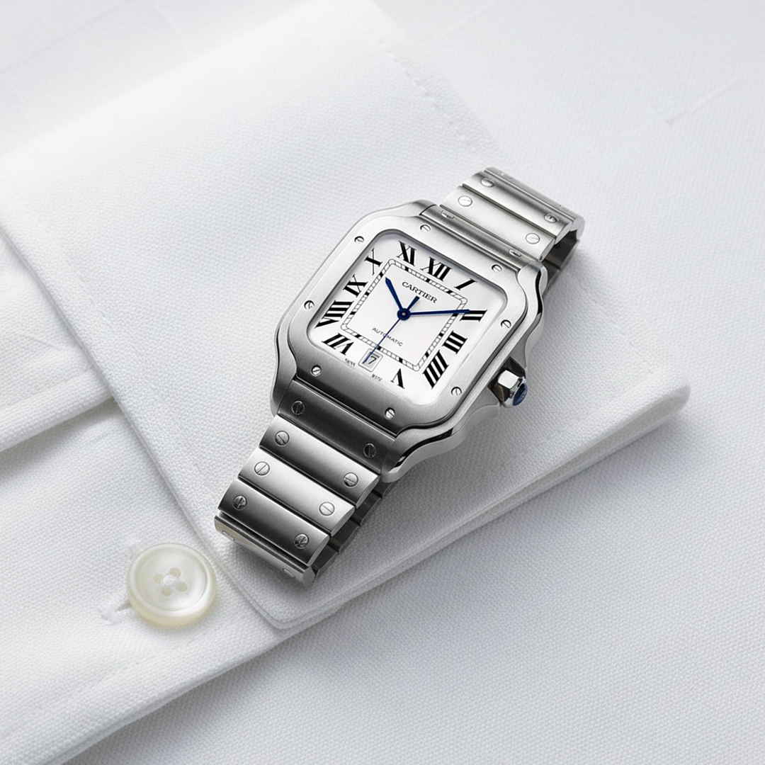 Le boîtier carré iconique aux lignes architecturales audacieuses se distingue par ses vis apparentes emblématiques, créant un équilibre harmonieux entre robustesse et raffinement. Dotée d’un cadran blanc argenté avec chiffres romains noirs et aiguilles en acier bleui, cette montre automatique incarne l’excellence horlogère et le design visionnaire. Le cabochon de saphir bleu signature sur la couronne apporte la touche finale parfaite.